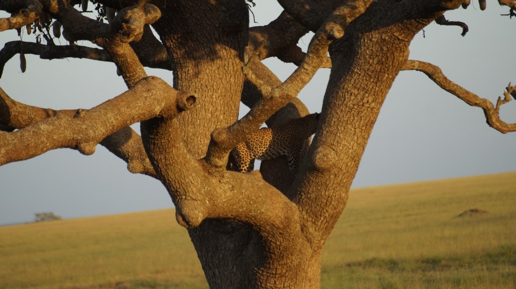 Il Serengeti è un’immensa pianura, nel vero e proprio significato del termine: più di tremila km quadrati. Vi lascio immaginare la vastità di strade da percorrere. Questo parco più di ogni altro può implicare ore ed ore di jeep senza vedere ‘nulla’, ma la natura che lo caratterizza è sempre in grado di ripagare la temporanea assenza di animali. Devo dire che anche qui abbiamo avuto fortuna. Nel raggiungere il nostro accampamento abbiamo assistito ad un tramonto meraviglioso. Proprio quello a cui si pensa quando si tenta di immaginare un tramonto nel bel mezzo della Savana. Ma la natura è stata ancora più magnanima e ci ha concesso di vedere anche uno splendido e raro leopardo. Era nascosto tra l’erba alta, ma l’esperto occhio della nostra guida l’ha scovato. Ci siamo fermati ad ammirarlo, immobili e in silenzio, fino a quando ha deciso di uscire allo scoperto, per arrampicarsi su di un grande albero.