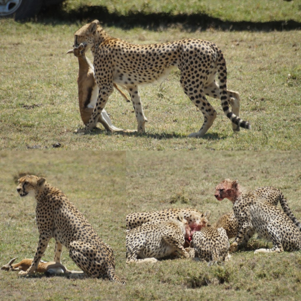 Una mamma ghepardo ha infatti cacciato una gazzella, per sfamare lei e i suoi cuccioli. ll ghepardo d’un tratto ha cominciato a correre ad una velocità pazzesca, inseguendo un branco di gazzelle. Come potete ben immaginare, la gazzella più lenta, è stata la sfortunata: la preda. L’ha azzannata per il collo e uccisa. È tornata di corsa dai suoi cuccioli con il bottino tra i denti e hanno diviso il pasto. Quei cuccioli, così dolci a vedersi, non hanno fatto tanti complimenti, si sono avventati sulla vittima e hanno pranzato. I volti dell’allegra famigliola si sono tutti insanguinati. Era strano, come osservarli, non mi facesse impressione. Anzi, mi sono quasi intenerita nel vedere come, a fine pasto, mamma ghepardo li abbia ripuliti dal sangue. Leccandoli ad uno ad uno. Della gazzella inutile dirvi che sono rimaste solo le ossa. La dura legge della sopravvivenza.