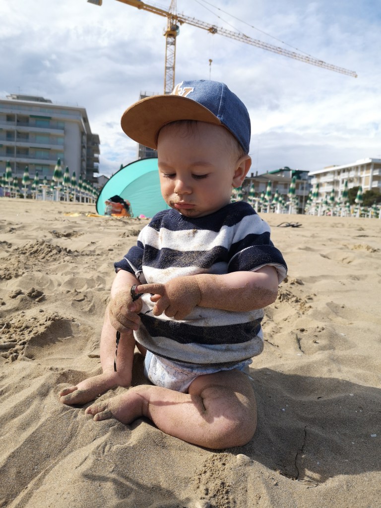 H come… lo ammetto ho cercato su google ‘parole con l’H’ e ho chiesto anche aiuto a Daniele. Lui ha suggerito ‘hostess’, declinando il suo preziosissimo e pertinente aiuto, ho optato per ‘habitat’. Mi sono resa conto che il mio bimbo si è ritrovato proprio all’interno di un ‘habitat naturale’ adatto a lui. Oltre alla riconosciuta e rigenerante aria buona di mare, anche gli spazi erano quelli giusti per poter sperimentare tutta la sua curiosità. Stando sulla sabbia ha imparato a muoversi moltissimo e a farlo senza paure. Ha fatto sua l’arte del ‘cadere’, cominciando ad arrampicarsi sulle sdraio, su di noi e anche sulla povera Rachele. L’ambiente circostante probabilmente l’ha fatto sentire sicuro e libero di lanciarsi, portando a casa tante conquiste. Una volta tornato a casa infatti, dopo poco, è partito a gattonare. Credo proprio che la sabbia e la spiaggia siano state una preziosa e stimolante palestra.